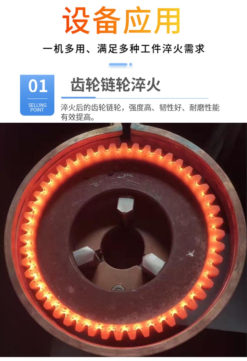 該設備是對齒輪、鏈輪、齒圈等帶齒工件的表面淬火處理設備,齒輪淬火的目的是為了加強齒輪的韌度,目前齒輪淬火設備主要應用于各種齒輪、鏈輪、軸類的淬火,各種半軸、板簧、撥叉、氣門、搖臂、球頭銷等汽車配件的淬火。